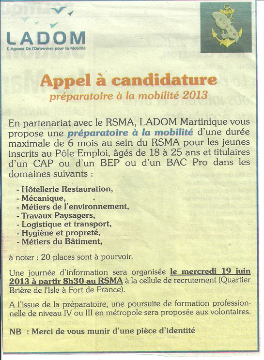 Nous en présentons comme preuve le placard publicitaire publié conjointement par LADOM et le SMA, dans le journal France-Antilles du mardi 11 juin 2013, incitant nos jeunes à la « mobilité » !