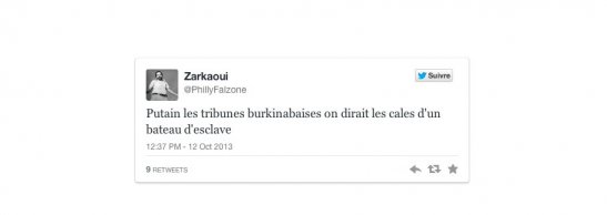 Ainsi, à l’occasion d’un match de qualification pour la Coupe du monde 2014 qui a opposé le Burkina Faso à l’Algérie, samedi 12 octobre 2013, à Ougadougou, l’on a pu assister à un véritable déferlement raciste de la part des supporters algériens vis à vis des joueurs Burkinabés. Dans les tribunes, et sur le réseau social twitter, de nombreuses insultes raciales ont été proférées, traitant les joueurs de "singes", de "nègres", ou de "mangeurs de bananes". Des incidents qui de seront probablement pas ’objet de suites judiciaires, mais qui n’ont pas empêché la victoire au match aller du Burkina Fasso. Le match retour, qui doit se jouer à Blida en Algérie pourrait faire l’objet de dispositifs renforcés de sécurité.